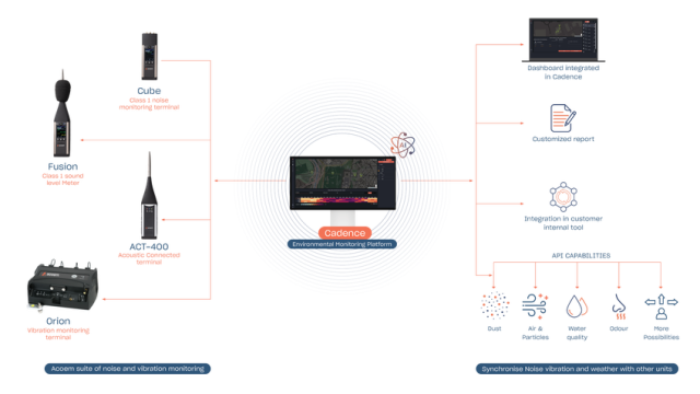 Το Cadence™ αποτελεί την προηγμένη διαδικτυακή (cloud-based) πλατφόρμα της Acoem για την κεντρική διαχείριση και ανάλυση μετρήσεων θορύβου και δονήσεων. Σχεδιασμένο με γνώμονα την κλιμακωσιμότητα, υποστηρίζει από μεμονωμένους σταθμούς έως εκτεταμένα δίκτυα αισθητήρων (FUSION, CUBE, ORION). Παρέχει στους μελετητές και τους διαχειριστές έργων ένα πλήρως παραμετροποιήσιμο περιβάλλον ελέγχου (dashboard) για την παρακολούθηση των περιβαλλοντικών δεικτών σε πραγματικό χρόνο.